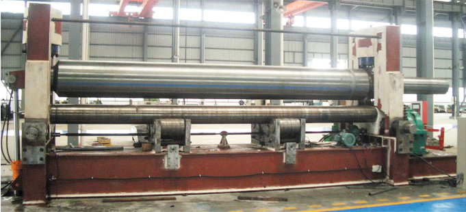 概述:液压式三辊对称卷板机结构形式为三辊对称式,上辊在两下辊中央对称位置通过液压缸内的液压油作用于活塞作垂直升降运动,通过主减速机的末级齿轮带动两下辊齿轮啮合作旋转运动,为卷制板材提供扭矩。规格平整的塑性金属板通过卷板机的三根工作辊(二根下辊、一根上辊)之间,借助上辊的下压及下辊的旋转运动,使金属板经过多道次连续弯曲,产生永久性的塑性变形,卷制成所需要的园筒、锥筒或它们的一部分。液压式三辊对称卷板机缺点是板材端部需借助其它设备进行预弯。液压式三辊对称卷板机适用于卷板厚度在50mm以上的大型卷板机,两下辊下部增加了一排固定托辊,缩短两下辊跨距,从而提高卷制工件精度及机器整体性能。