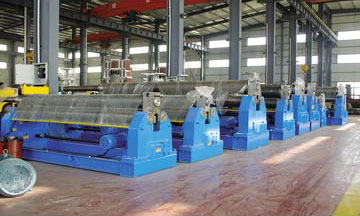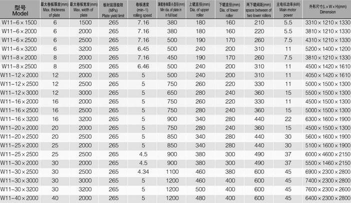 概述:机械式三辊对称卷板机结构形式为三辊对称式,上辊在两下辊中央对称位置通过锥齿轮传动作垂直升降运动,通过主减速机的末级齿轮带动两下辊齿轮啮合作旋转运动,为卷制板材提供扭矩。规格平整的塑性金属板通过卷板机的三根工作辊(二根下辊、一根上辊)之间,借助上辊的下压及下辊的旋转运动,使金属板经过多道次连续弯曲,产生永久性的塑性变形,卷制成所需要的园筒、锥筒或它们的一部分。机械式三辊卷板机缺点是板材端部需借助其它设备进行预弯。